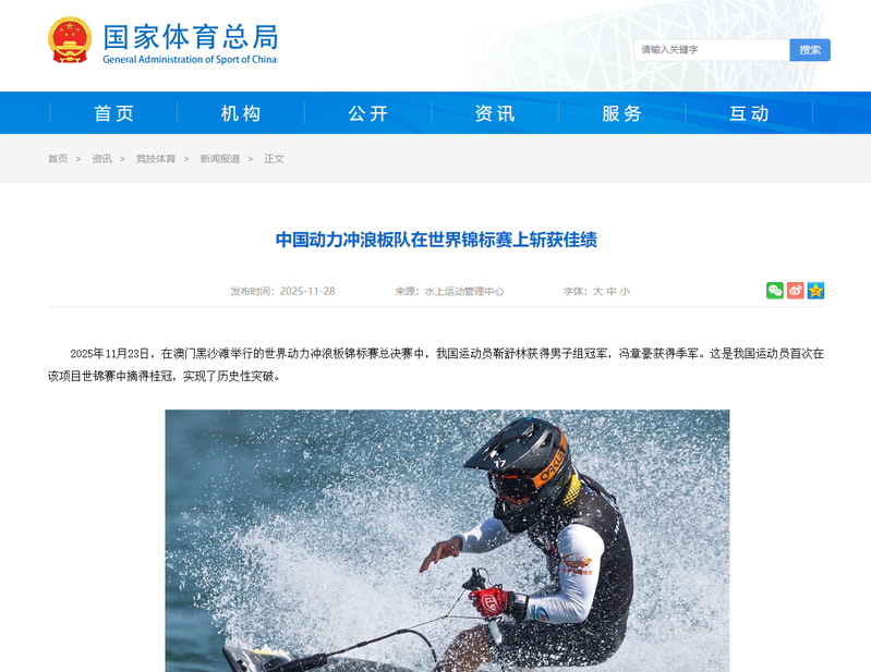 国家体育总局:中国动力冲浪板队在世界锦标赛上斩获佳绩