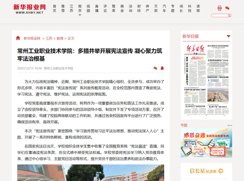 新华报业网:常州工业职业技术学院:多措并举开展宪法宣传 凝心聚力筑牢法治根基