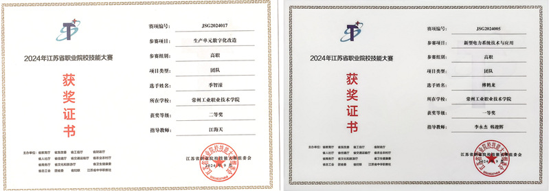 学生积极参加各类技能技术比赛,获得2025年世界职业院校技能大赛总决赛争夺赛智能装备应用赛道国赛金奖、江苏省“挑战杯”大学生课外学术科技作品“恒星级”一等奖、江苏省职业院校技能大赛“新型电力系统技术与应用”一等奖、江苏省职业院校技能大赛“生产单元数字化改造”二等奖等。