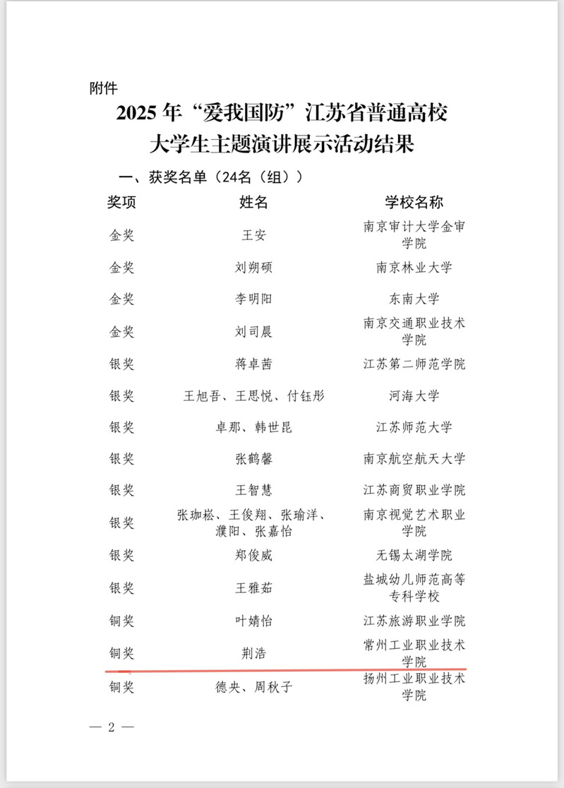 在2025年“爱我国防”江苏省普通高校大学生主题演讲展示活动中,我校数字商务学院学生荆浩的作品《精神的接力棒:从烽火岁月到青春征程》荣获铜奖,陶莉、马润萱老师获评“优秀指导老师”荣誉称号。演讲以生动的历史叙事和真挚的当代感悟,串联起不同时代为国奉献的感人故事,并结合同辈献身国防事业的戎旅生涯和选手自身参与国防宣讲的经历,表达了新时代青年传承精神、强国有我的决心。该奖项的获得,体现了我校在通过多样形式深化学生国防观念、培养爱国主义情怀方面的有效成果。