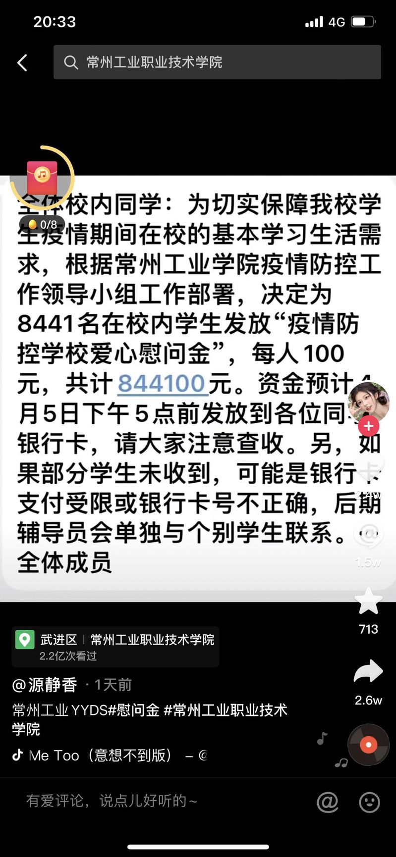 4月5日,我校一网名为“源静香”的学生将学校发放的100元“疫情防控爱心慰问金”制作成抖音小视频,点击量高达2.2亿,让常州工业职业技术学院的“疫情防控爱心慰问金”迅速走红网络。