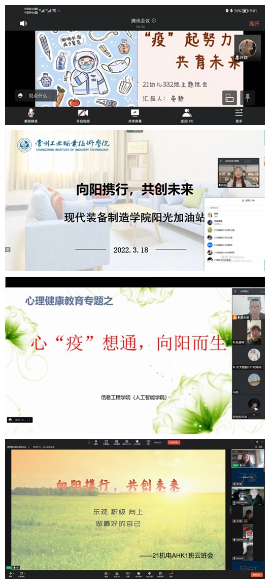 为进一步培育我校学生积极的心理品质,有效缓解因疫情影响给学生带来的心理压力和紧张情绪,我校积极响应江苏省教育厅《关于组织开展“向阳携行 共创未来——大学生心理健康教育江苏行”主题教育活动的通知》文件精神,组织全校学生分年级、分班级开展“向阳携行 共创未来”心理云班会活动,实现全员参与,全力守护,用心陪伴。