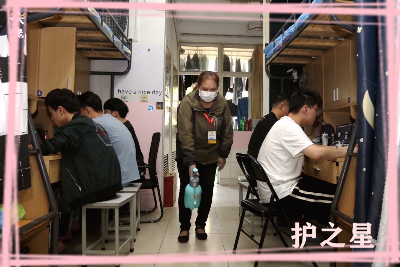 “阿姨”这个称呼,在校园一向都象征着公寓门前的她们。检查宿舍卫生,保证学生安全就寝,督促同学们佩戴口罩,不间断地清洁、消杀……好像阿姨不再是“阿姨”,更像是每栋学生公寓里孩子们的母亲。细心呵护,贴心照料,看见她们的笑脸便倍感安心。她们是校园里的一颗颗“护之星”。