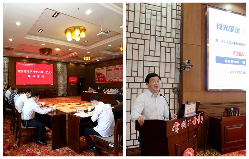 近日,在常州工业职业技术学院全面开启职业教育活动周之际,学校党委理论学习中心组(扩大)在图文楼1101会议室召开集体学习会,专题学习新修订的《中华人民共和国职业教育法》,党委理论学习中心组全体成员出席会议。党委书记缪昌武主持会议。