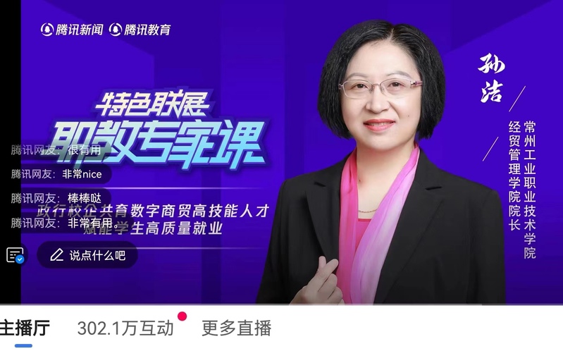 5月13日,我校经贸管理学院院长孙洁教授受邀举行了腾讯新闻《职教专家课》直播讲座,讲座以《政行校企共育数字商贸高技能人才 赋能学生高质量就业》为主题,分享了高职教育相关政策及高水平院校创建成果,介绍了国际商务专业群人才培养模式、创新教学团队、数字商贸人才培养特色、学生高质量就业,以及政行校企合作育人情况。