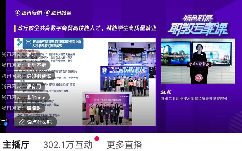 整场课程直播的在线收看互动人数高达302.1万人次,引起了很大的反响。观看直播的观众踊跃留言,纷纷表示聆听孙洁教授的直播课之后深受启发,不仅更加深入地了解了高职教育,也对我校坚持高质量党建引领高质量发展理念表示高度认同,对经贸管理学院各专业的人才培养特色留下了深刻印象。
