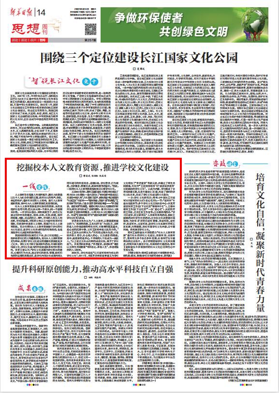 6月14日,《新华日报》第14版(理论版)“思想周刊”刊发我校学校文化研究阐释文章:《挖掘校本人文教育资源,推进学校文化建设》。文章展示了我校借力“校本人文教育资源”进行学校文化建设、涵养工匠精神方面的深度思考。
