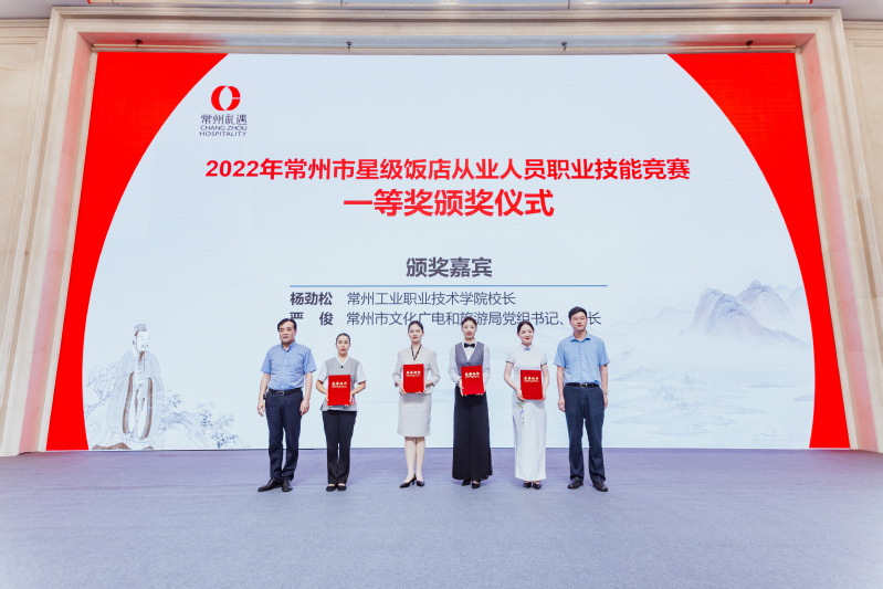 7月19日,由我校承办的常州市星级饭店从业人员服务技能竞赛在九洲喜来登酒店正式拉开序幕,常州市人民政府副市长蒋鹏举,我校校长杨劲松,市政府副秘书长陈峰,市文旅局党组书记、局长严俊等领导出席了活动,并为获奖选手进行了颁奖。