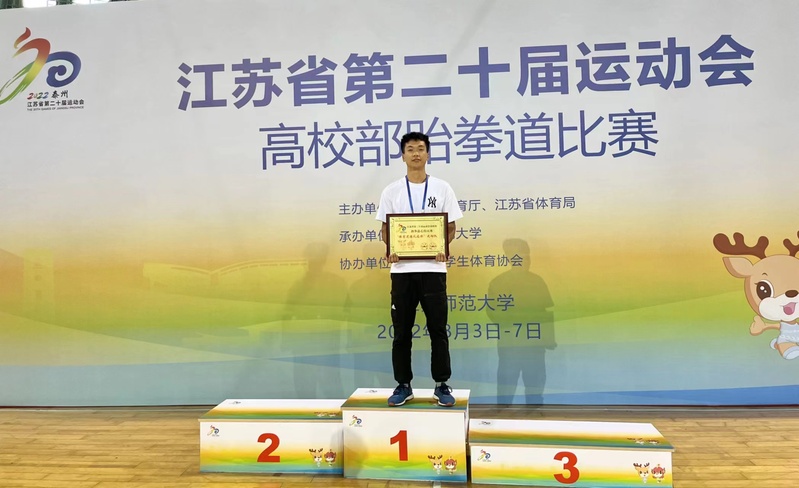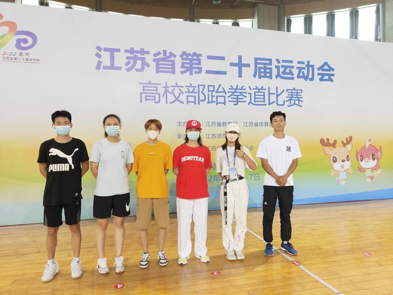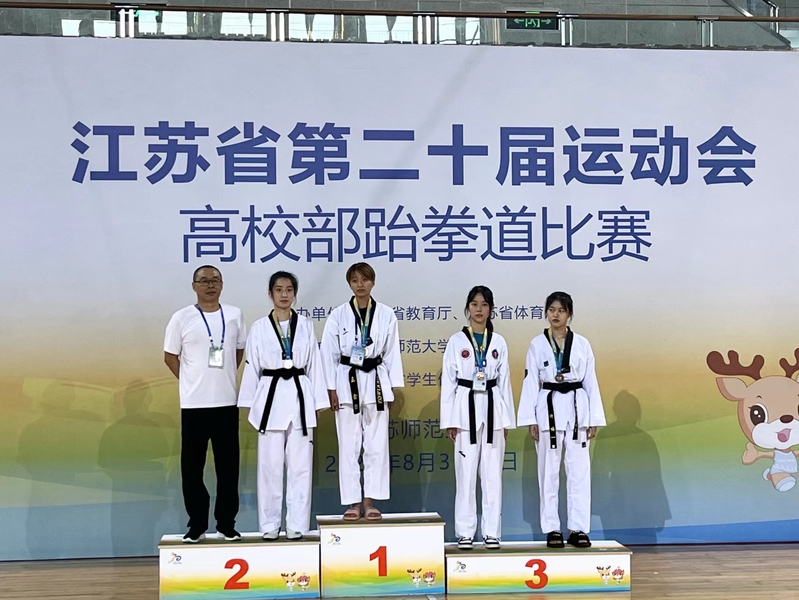 8月3日至8月7日,江苏省第二十届运动会高校部跆拳道(乙组)比赛在江苏师范大学泉山校区举行。我校跆拳道队7名运动员在领队钱北军,教练员陈国超、尹奎的带领下,获第一名1项、第五名2项的优异成绩,创造了我校历届省运会跆拳道比赛参赛成绩的新纪录。