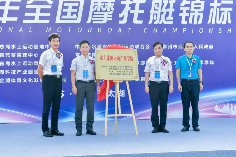 8月19日上午,在风光旖旎的西太湖揽月湾广场,由国家体育总局水上运动管理中心、江苏省体育局水上运动管理中心、江苏奇峰金澜体育文化发展有限公司和我校合作共建的水上休闲运动产业学院在2022年全国摩托艇锦标赛开幕式上揭牌成立,国家体育总局水上运动管理中心党委书记、主任李瑞林,江苏省体育局水上运动管理中心主任刘翊群、常州市体育局局长杜吉宾与我校校长杨劲松一起为水上休闲运动产业学院揭牌。这是我校贯彻落实教育部《深化体教融合,促进青少年健康发展意见通知》和国家体育总局《“十四五”体育发展规划》,深入推进体教融合、体旅融合的一次重要探索和实践。
