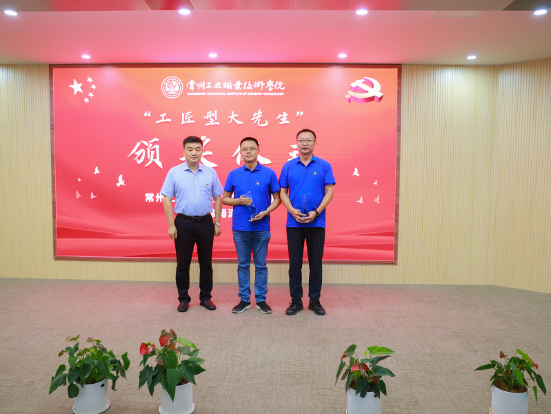 开幕式上,席海涛为智能控制学院首批“工匠型大先生”获得者蒋金伟、黄祥源颁发奖杯。