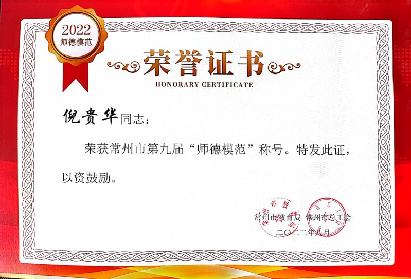 近日,常州市第九届师德标兵和师德模范名单公布,我校现代装备制造学院倪贵华副教授荣获2022年度常州市“师德模范”荣誉称号。