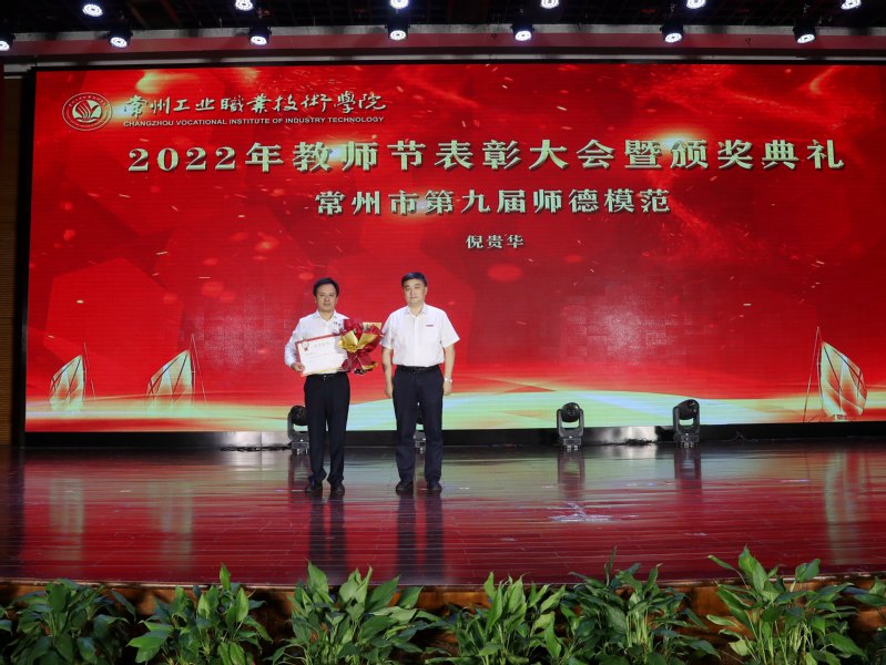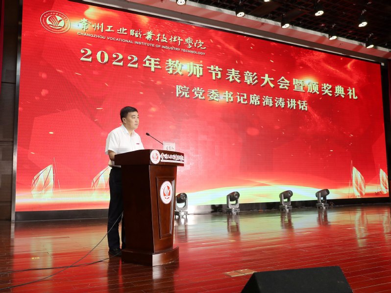 党委书记席海涛为常州市第九届师德模范倪贵华、10位师德标兵颁发了奖牌和鲜花。他表示,过去的一年,学校各项事业蒸蒸日上、蓬勃发展。这些成绩,离不开广大教职工、全校师生的付出。值此教师节来临之际,他代表校党委和行政向广大教职工送上诚挚的问候,向从教满30年的老教师致以崇高的敬意,向光荣退休的教职工致以美好祝愿,向新入职的各位教职工表示热烈的欢迎。
