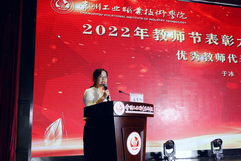 信息工程学院教师于冰代表优秀教师发言。她以人梯、烛火为例阐述了自己的从教理念,希望同广大教职工一起崇师德,重教育,脚踏实地为学校发展共同奋进。
