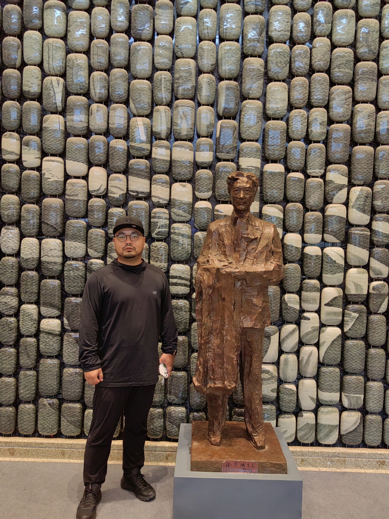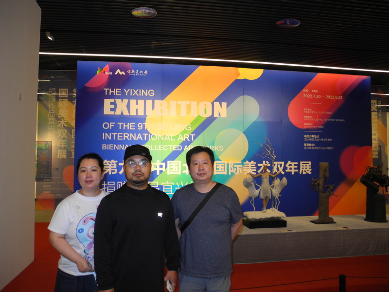 6.与两位专业老师刘星(左)和张晔(右)在他设计的美术展览舞台画面前合影