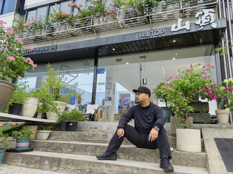 1.周浩楠一身缁衣,坐在“山顶空间”的台阶上,像梵高一样思考