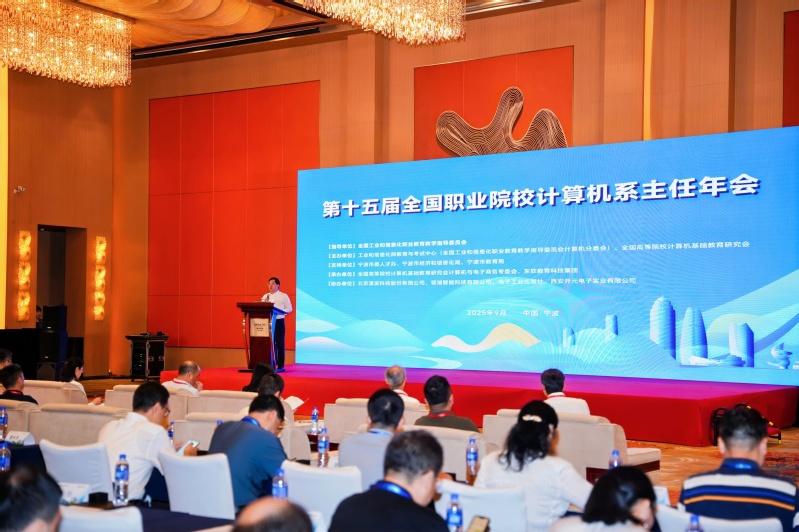 9月21日,第十五届全国职业院校计算机系主任年会在浙江宁波召开。本届年会由工业和信息化部教育与考试中心、全国高等院校计算机基础教育研究会联合主办,以“数智融合·产教协同”为主题,汇聚全国职业教育领域的专家学者、院校代表及行业企业精英,共话人工智能时代下的职业教育改革与高质量发展。我校副校长檀祝平应邀出席,并在“工信领域产教融合”平行论坛上作《两翼齐飞,打造产教融合新形态》专题汇报,系统展示了学校在国家级行业产教融合共同体建设中的创新实践与显著成效。