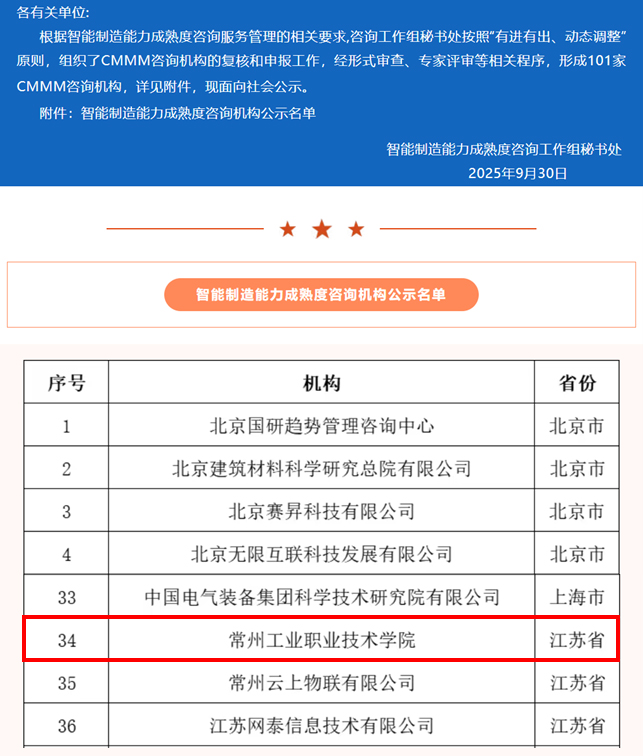 近年来,我校积极响应国家智能制造发展战略,成立了以CMMM主任评估师、培训讲师卢剑伟教授为院长的常州工业数字化创新研究院(以下简称“数研院”),截至目前已成功为广汽因湃、北汽重卡、烟草行业、TCL、西门子、梅特勒-托利多等五十多家知名企业提供智能制造相关服务,助力企业提升生产效率、降低运营成本,实现智能化升级;联合中国电子技术标准化研究院在国内率先开设了以《智能制造能力成熟度模型》国家标准为引领的智能制造课程;承办了全国数字化转型国家标准(DTMM)培训班,与武进高新区联合举办了2024年首期智能制造CMMM普及培训班、与武进区联合举办2025年护航新型工业化网络和数据安全活动等重要行业活动,为区域乃至全国智能制造领域的人才培养与技术交流搭建了优质平台。入选常州市智改数转网联服务商,并承建了常州市数字化转型促进中心。