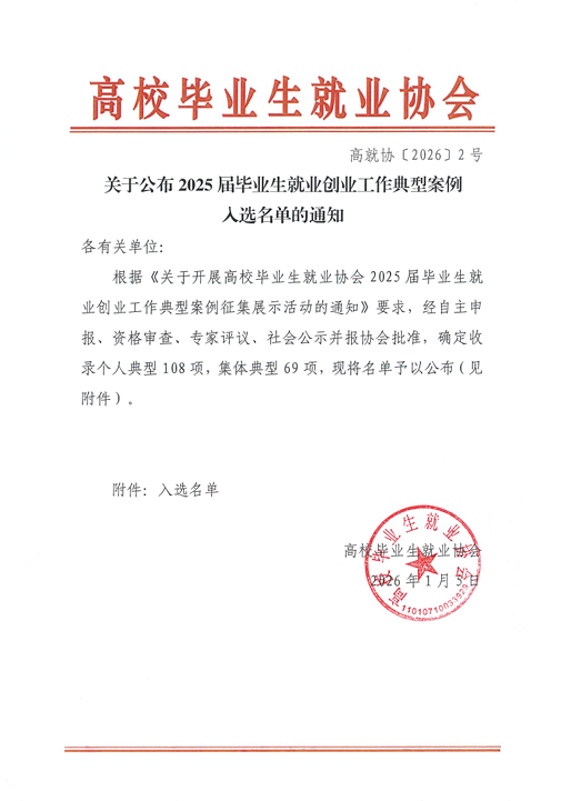 近日,高校毕业生就业协会发布2025届毕业生就业创业工作典型案例入选名单。此次评选共遴选出全国个人典型108项、集体典型69项,我校2项个人典型案例和1项集体典型案例成功入选。