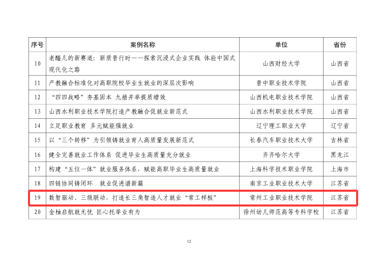 我校申报的集体典型案例《数智驱动、三级联动,打造长三角智造人才就业“常工样板”》,构建了“校—院—企”三级就业服务体系,依托智慧就业平台整合岗位资源,通过大数据分析实现岗位信息精准推送,联动二级学院深耕行业需求、企业参与人才培养全过程,精准对接长三角地区智能制造产业人才需求,为区域产业升级输送了大批技术技能型人才,打造了具有高职特色的就业服务新模式。